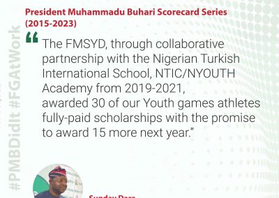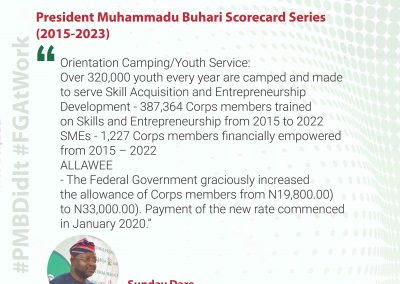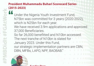 President Muhammadu Buhari came to power in 2015 to tackle corruption, revamp the economy through policies and the provision of infrastructure as well as the fight against insecurity. After his 8-years mandate, President Buhari has acquainted himself creditably in delivering on the promises he made to Nigerians during the campaign. This portal is the one-stop-shop to access the achievements of the Buhari Administration.